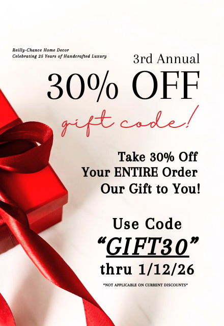All Reilly-Chance, Gallery Designs Lamps, and Sir Oliver's Home Decor products are handmade by us at our facility in Texas. After 15 years of selling our Luxury Bedding and Home Decor products to stores across the country, Reilly-Chance Luxury Bedding and Sir Oliver's Decorative Candles and Home Decor products are now Exclusively available only at our online store.