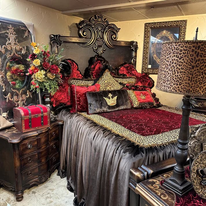 The Camelot collection combines a palette of rich, dark chocolate with deep, red and leopard print. The pillows are embellished with beautiful beads, tassel fringe, braids and Crown Medallions covered in crystals. Design elements combine here to create a rich look fit for any Castle. Our oversized bedding is designed to fit the larger beds of today with ample drop on both the duvet and the dust skirt.
