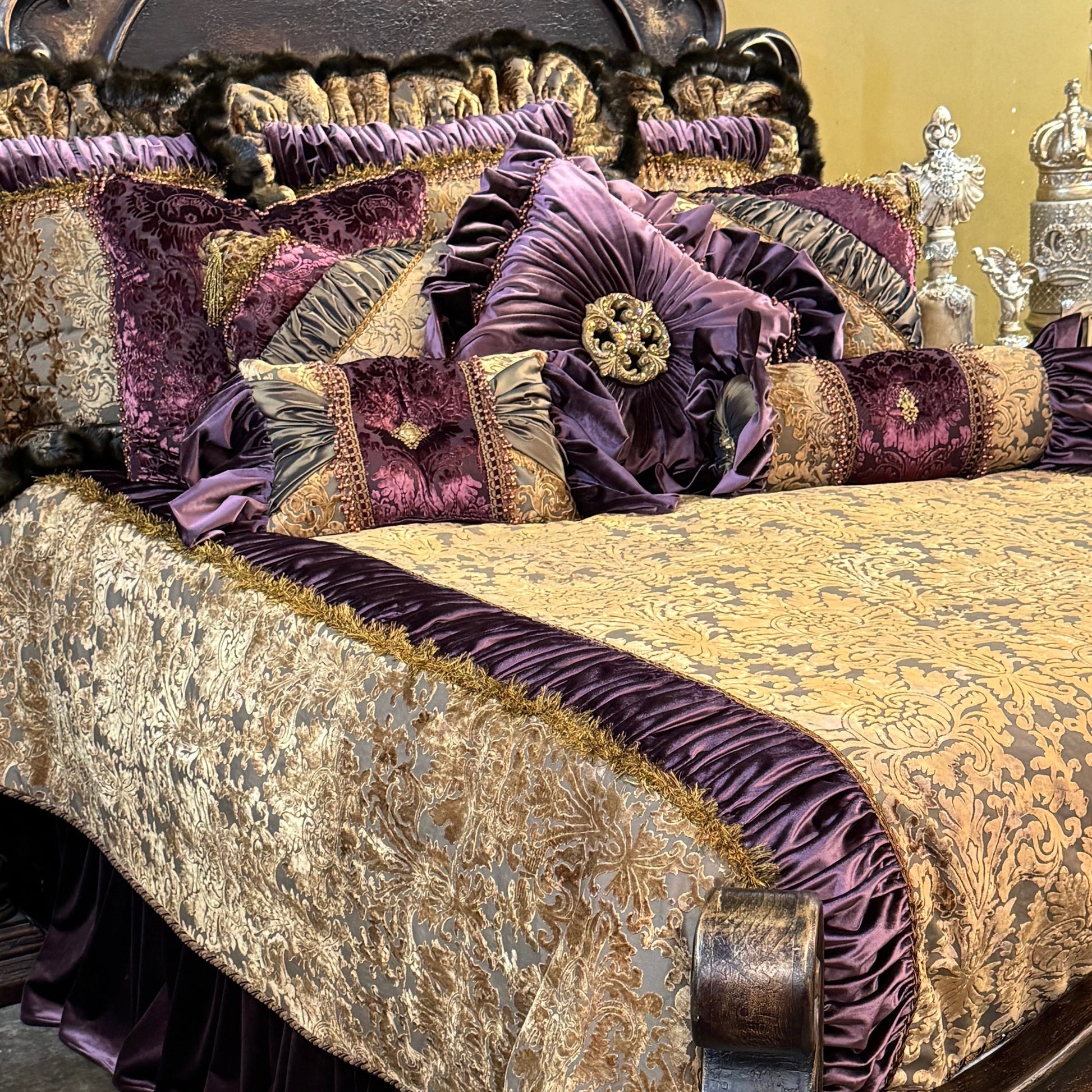 Château Luxury Bedding Collection reflects the fine country manor house of nobility in the French regions. This beautiful bedding design combines soft golden cut velvet with various shades of rich aubergine and a touch of olive green. Château Bedding will create for you a room of rich beauty and respite.