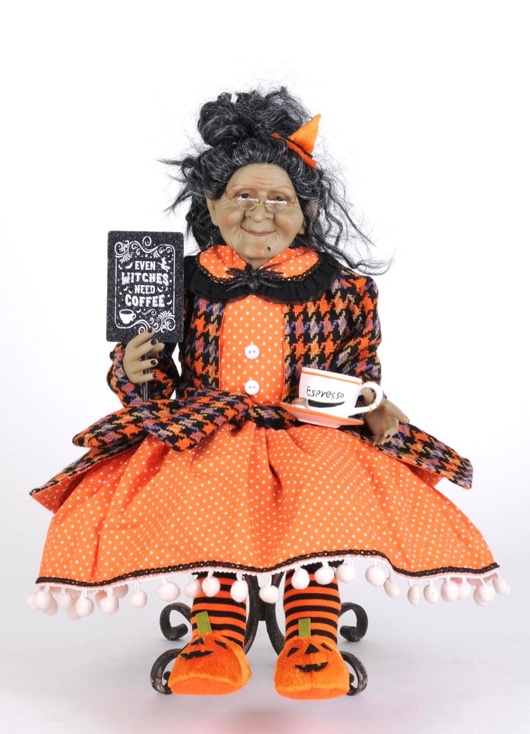 Start your spooky mornings right with this delightful Coffee Witch Figurine, a whimsical addition to your Halloween décor that proves even the most magical beings need their caffeine fix. Add a dash of humor and a shot of espresso to your Halloween decorations with this bewitching barista! Stool is not included.