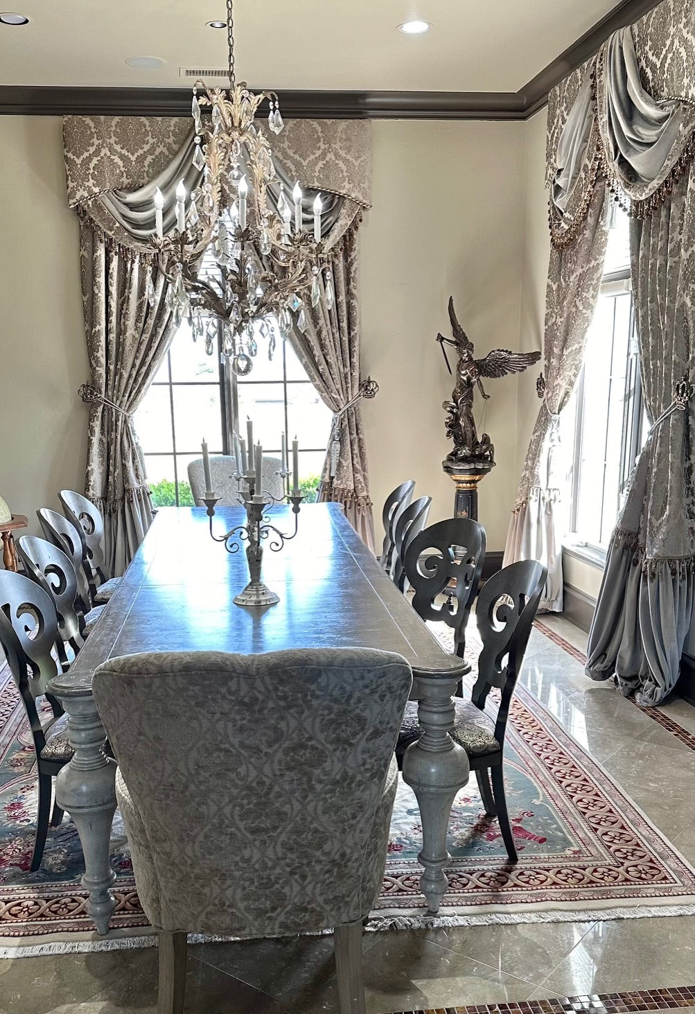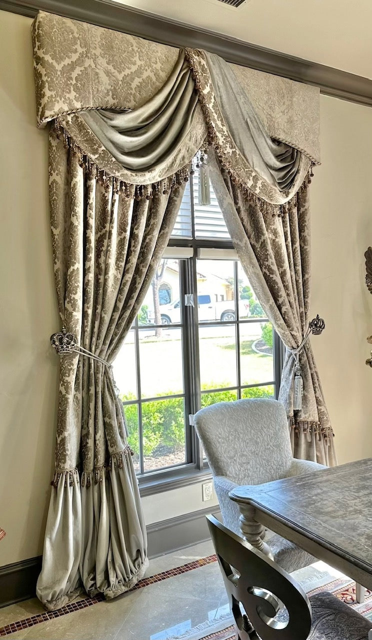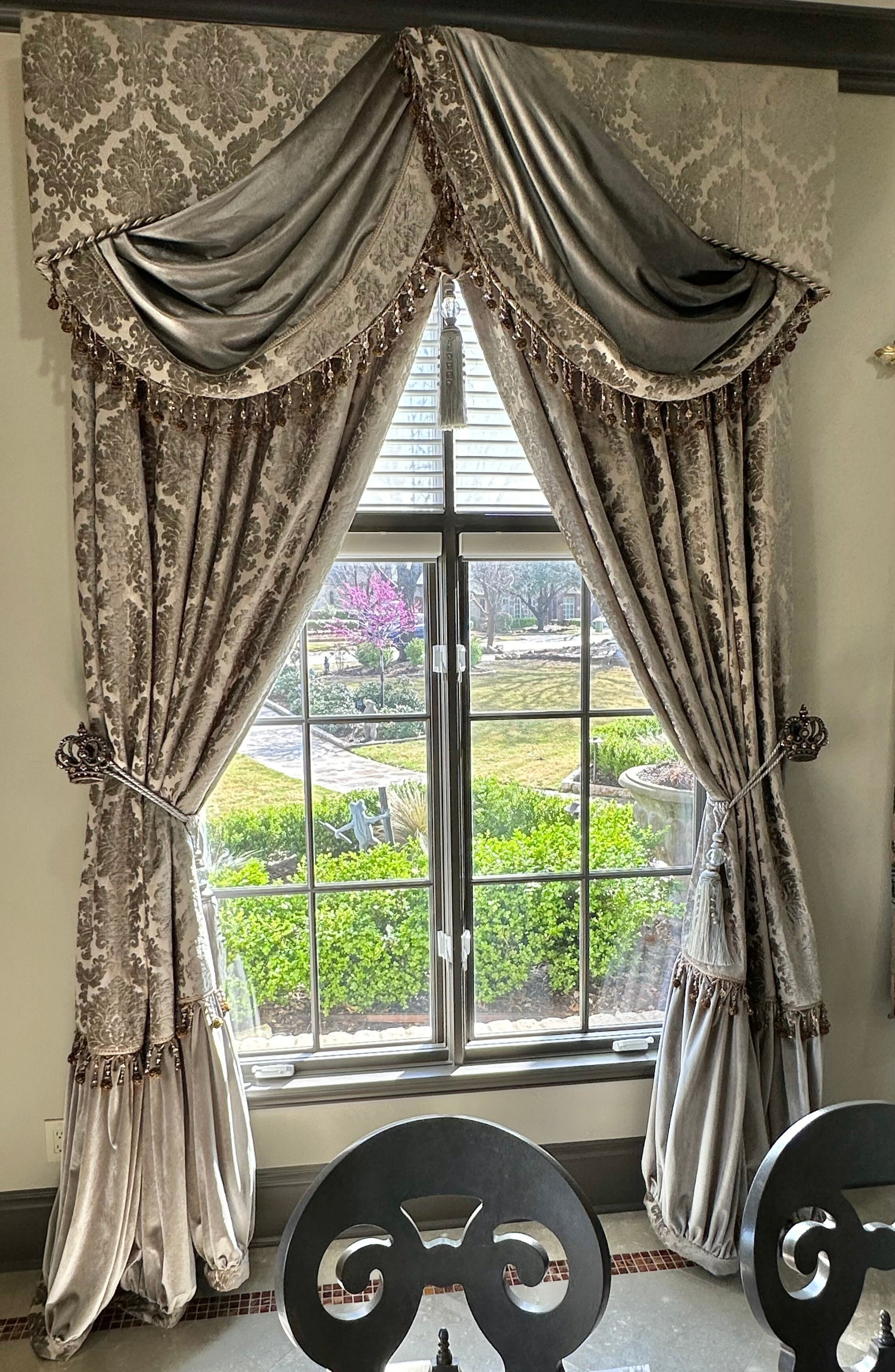 The Swags and Curtain panels are embellished with over-sized beads and trims for a look that will enhance most any Dining or Living Room!