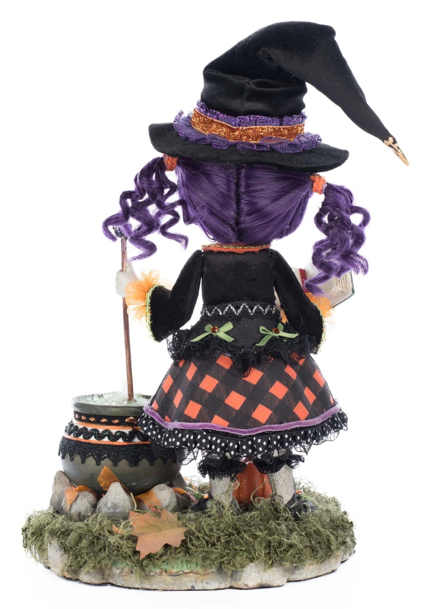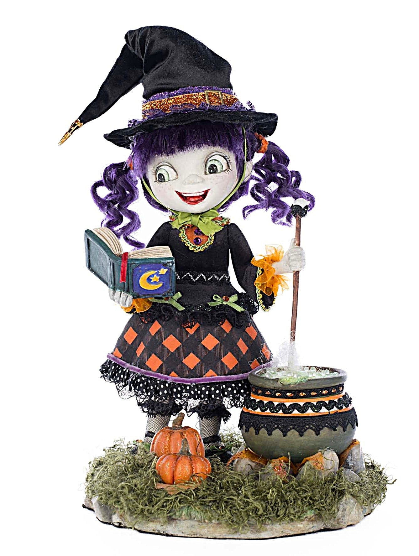 Poppy Broomson Tabletop conjures festive magic, waving her wand over a bubbling cauldron with glowing delight. Dressed in black velvet and buffalo check, adorned with trims and ruffles, she radiates charm. Her rich purple ringlets complete the look.