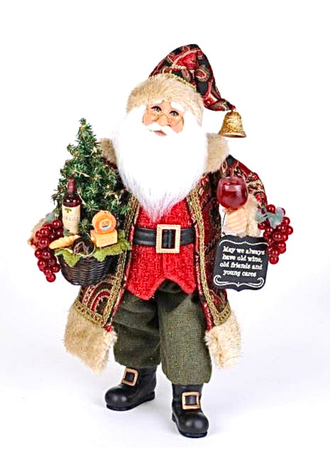 The Lighted Wine & Cheese Sampling Santa is great for any bar, kitchen, and countertop. The quality is unmatched with this decorative piece's hand-painted face, inset eyes, unique fabric, and detailed accessories. With his affectionate and jovial saying and his beautifully lit wine basket, he's great as a gift or as a collectible item for your own family and he's sure to add character and style to any home. Lights are battery operated. This piece requires 2 CR2032 button batteries.